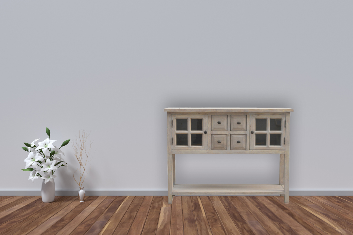 This console table would fit perfectly in any kitchen. It comes with 4 drawers and 2 glazed door cabinets with shelves inside providing useful storage space for your plates and cutlery. It is constructed from 100% solid mango wood which is meticulously hot dipped using a laborious caustic wash technique. This lengthy multi-stage finishing process gives a beautiful weathered and aged acid washed finish. Some other features include straight feet, round knob handles to the drawers, an under shelf and cabinets which are made from brass.