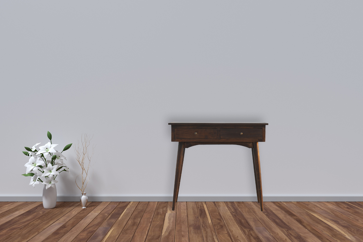 Simple, elegant, country-style charm is what this practical little console table will provide. Suiting most decors, this 100% solid mango wood unit has been built with sustainably sourced timbers and has two drawers to help you keep your home organised and storing any little household objects. This has shiny knobs and has a light walnut finish.