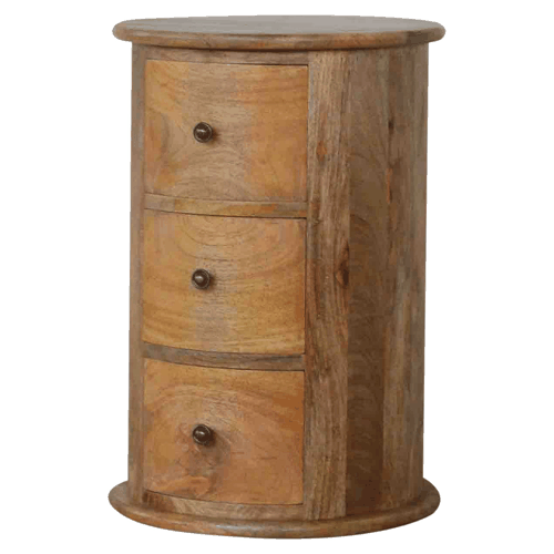 This beautiful round three drawer country style drum nightstand is made from 100% solid mango wood and has a fine oak-ish finish with shiny knobs on the drawers. The piece features three drawers perfect for storing small items like keys, loose change and space on top for displaying photos, ornaments and collectables. This product can be used as either a nightstand, end table or an occasional table. Every piece of furniture is individually handcrafted and includes swing care tickets explaining the cautions and aftercare instructions.