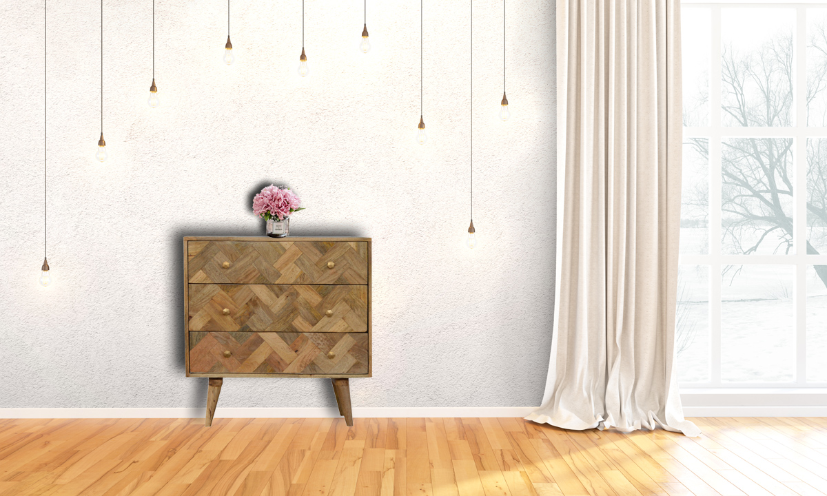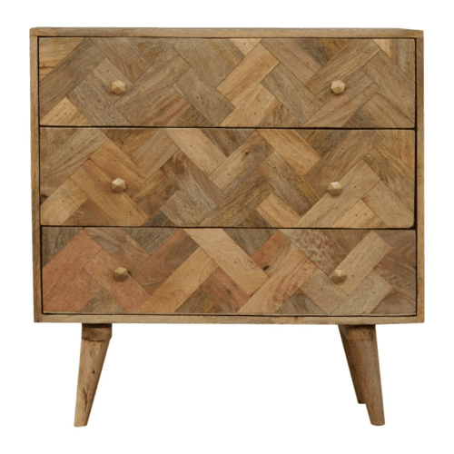 This piece offers a contemporary and versatile style of furniture for today’s modern interiors. It has been constructed from 100% solid mango wood and finished with a clear lacquer making the product durable and able to withstand years of use. It features a unique zig-zag patchwork design on the drawer fronts consisting of different shades of wood. Some other features include 4 Nordic style legs and shiny brass hexagon shaped knobs allowing easy access into the drawers.