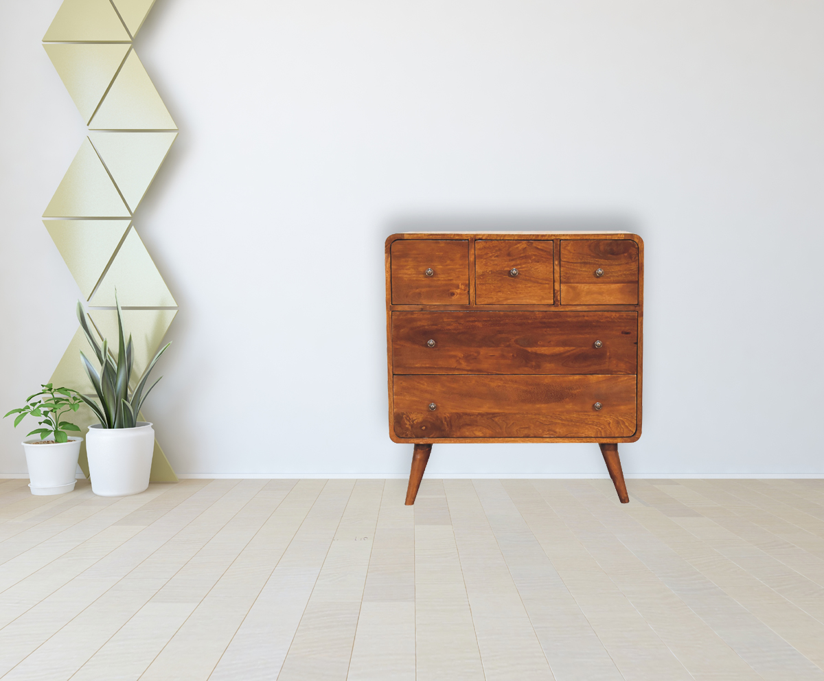 To match the other products from the curved collection, this 3 over 2 chest of drawers has been constructed from 100% solid mango wood in a rich chestnut finish and stands on 4 Nordic style legs. It features shiny accent knobs on each drawer providing easy access when storing any clothes, towels, duvets, etc. The curved design provides smooth, safe corners and gives the product a modern and contemporary look which is perfect for city homes and apartments.