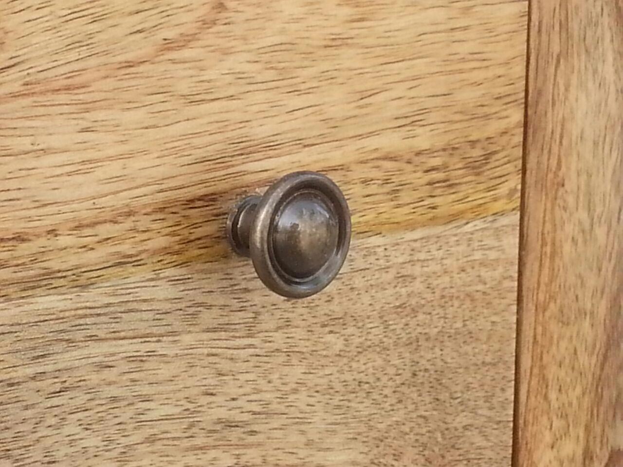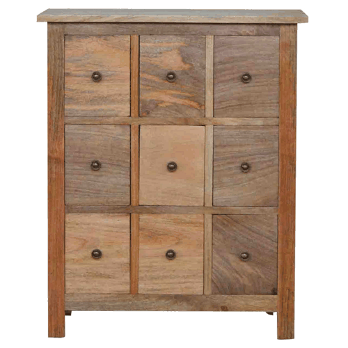 This stunning and practical mini chest features 9 drawers and has been constructed from 100% solid mango wood in an oak-ish finish giving it a truly rustic and romantic feel. It is an essential piece of furniture for the home giving you space to store clothing as well as providing a surface for all your bits and pieces. Every piece of furniture is individually handcrafted and includes swing care tickets explaining the cautions and aftercare instructions.