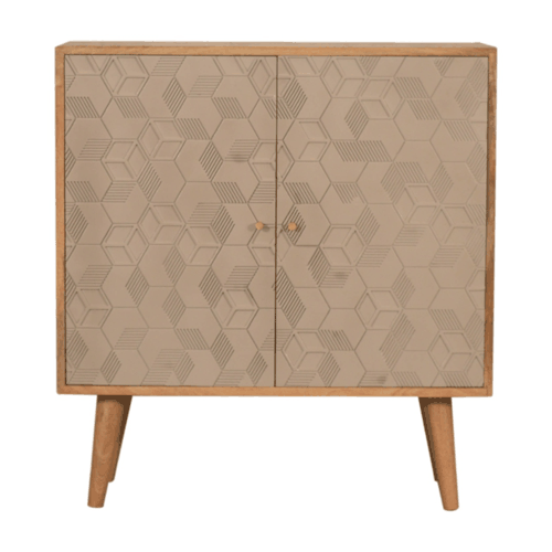This stunning piece has been constructed from 100% solid mango wood and features nordic style legs. It provides useful storage space and is finished with shiny brass knobs. The champagne cube design is partnered nicely with the finish of the wood giving an overall modern and chic look.