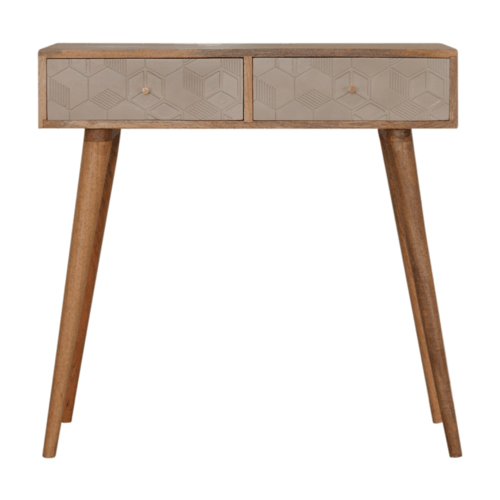 This stunning piece has been constructed from 100% solid mango wood and features Nordic style legs. It provides useful storage with the space of 2 drawers finished with shiny knobs. The champagne hand carved cube design is partnered nicely with the finish of the wood giving an overall modern and chic look.