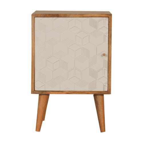This stunning piece has been constructed from 100% solid mango wood in an oak-ish finish and features Nordic-style legs. It provides useful storage with the space of 2 drawers inside and is finished with a shiny knob. The white hand-carved cube design is partnered nicely with the finish of the wood giving an overall modern and chic look.