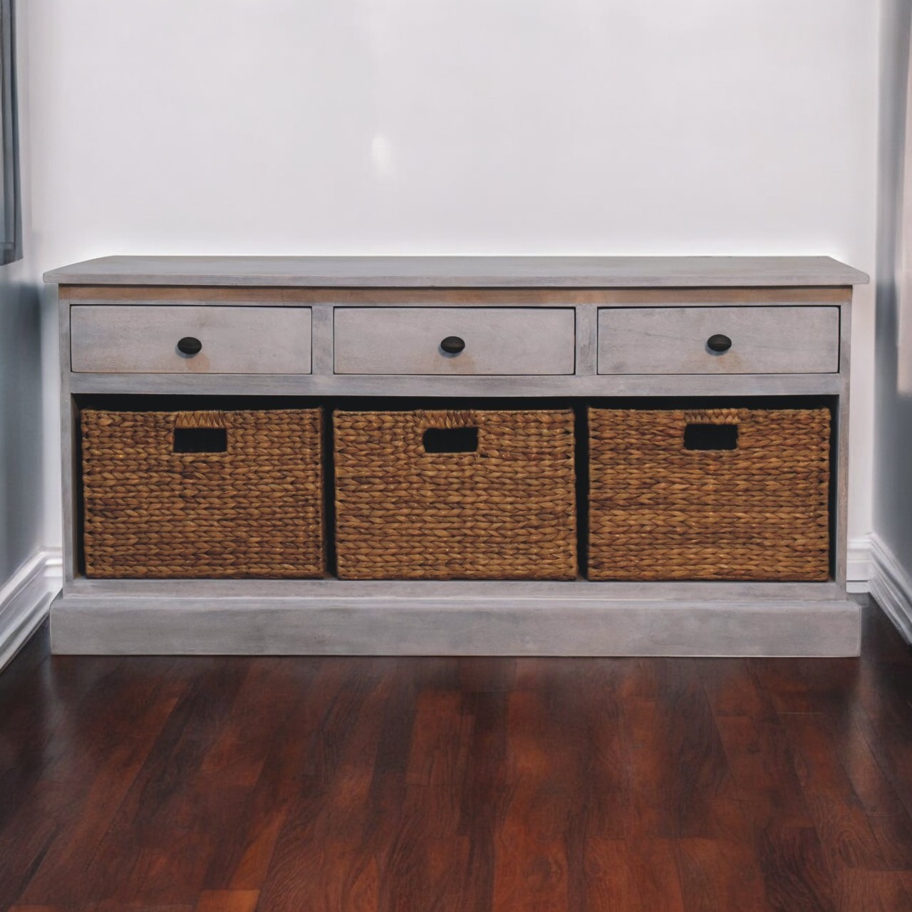 Discover our Acid Wash Basket Storage Cabinet, a perfect blend of sustainability, style, and functionality. Crafted with care, this piece brings a touch of vintage charm to your modern home. It has storage options with 3 drawers + 3 handwoven wicker baskets for shoes, accessories, and more. Perfect to add to the living room or hallway.