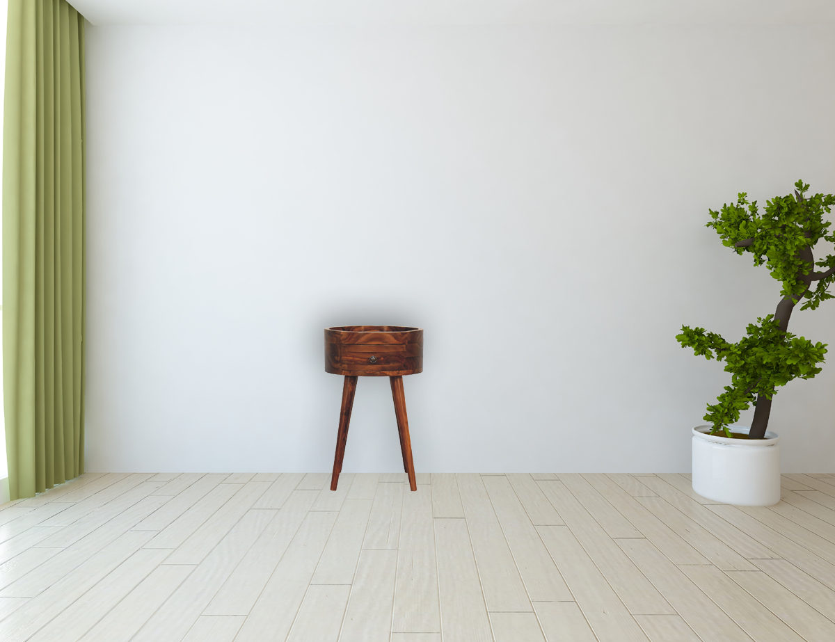 The mini alina honey finish nightstand is perfect for compact apartments and bedrooms. It will provide everything a nightstand should with a small drawer for storing any belongings, and space on top to keep things close by. It features nordic style legs, and has been constructed from 100% solid sheesham wood in a honey finish and topped with a shiny brass knob for easy access into the drawer.