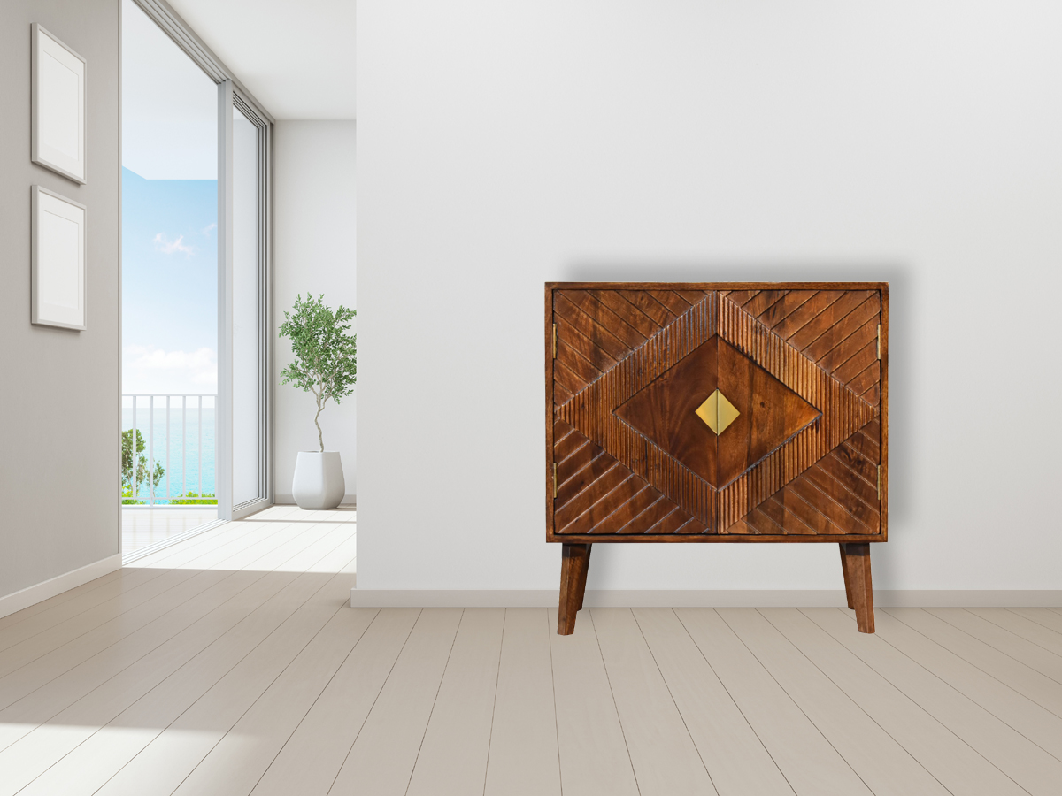 This striking Alma Cabinet has been made from 100% solid mango wood in a chestnut finish and offers a striking ridged design surrounded by a brass inlay diamond. Other features include 2 large open slots and nordic style legs. Place a plant, a photo frame or a favorite art piece on top and enjoy your new, contemporary living room or hallway.