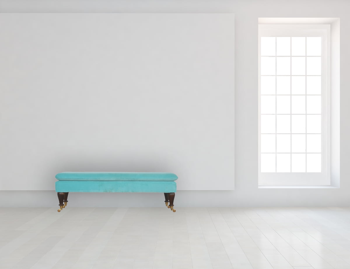 This bench is a great addition to the home. It has been upholstered in a beautiful aqua cotton velvet fabric and has walnut finish legs on castor feet to allow easy movement of the bench. A lovely and elegant piece for the home.