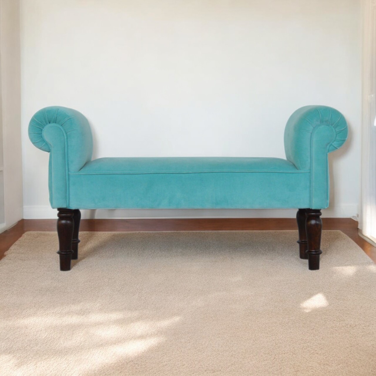This lovely piece of furniture is ideal for a hallway, end of the bed, or simply any living area in your home. This bench has been upholstered in a lush Aqua cotton velvet featuring turned legs constructed from 100% solid mango wood with a walnut finish. Giving a cosy yet classy touch to any room and proving handy all over the home, available in many different colours.