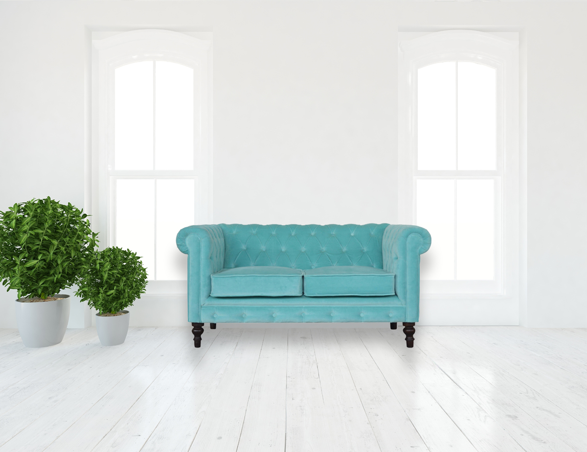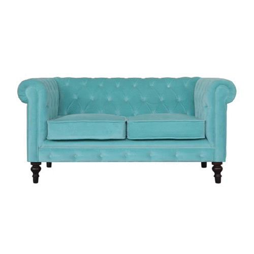 This beautiful 2 Seater Chesterfield Sofa has been upholstered in a luxurious smooth aqua cotton velvet. It features 4 turned feet constructed from 100% solid mango wood in a walnut finish. This sofa is detailed with deep button tufts, piping and sheltering arms. This is a statement piece which can be added as a pop of colour and be suited to different home settings.