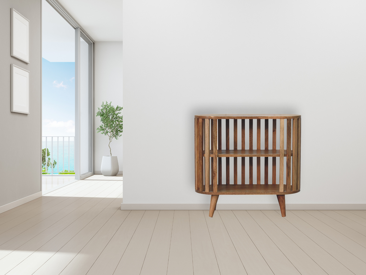 Update your home with our Ariella Cabinet boasting a contemporary Japanese design allowing light to shine through and is constructed from 100% solid mango wood in an oak-ish finish. This piece features two open shelves and space on top to display a plant, ornament, or photo frame.
