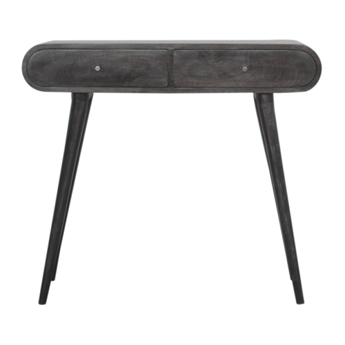 This solid wood console table has been constructed from 100% solid mango wood in an ash black finish and offers a unique shaped design with rounded edges. It features 2 drawers which come with shiny chrome coated knobs and Nordic style legs. A great simple and add to the home.
