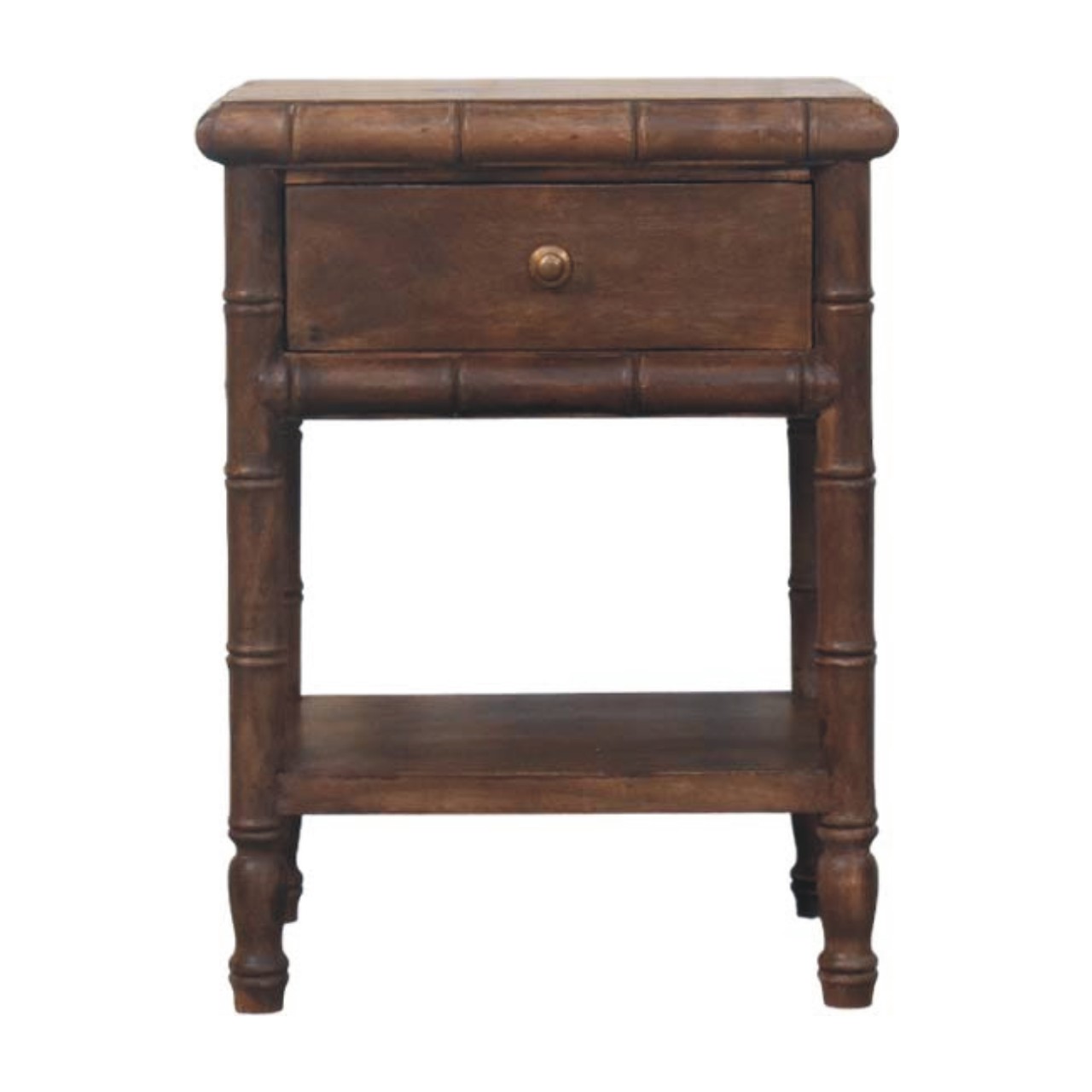 Inspired by tropical elegance, the Bamboo Carved Bedside Table brings refined charm to your nighttime sanctuary. Handcrafted from 100% solid mango wood in a rich roasted almond finish, this piece features delicately sculpted bamboo-style legs and edges. A single drawer with an antique brass knob offers discreet storage, while the open shelf below is perfect for books or décor. Compact yet stylish, it’s the perfect companion for your bed or reading nook.