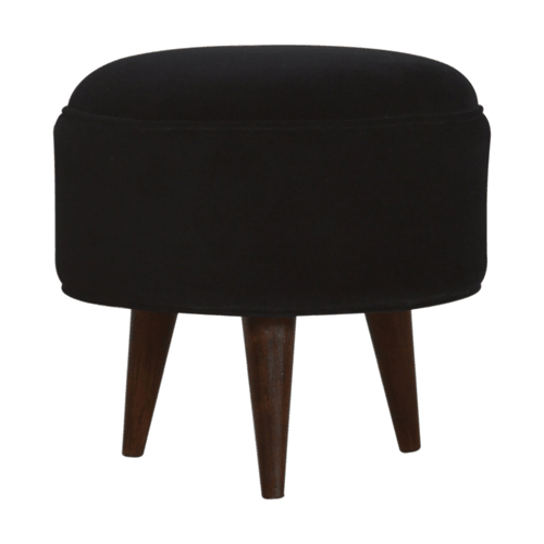 The beautiful and fashionable footstool is the perfect addition to any bedroom or living room. It is available in several different colours and has been upholstered in a luxurious black cotton velvet fabric perfect for putting your feet up, another feature of this is the 3 Nordic style legs in a walnut finish. You can use it as a handbag stand or just as an accent piece in the home.