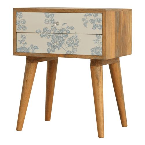This nightstand table is a versatile piece that will prove handy all over your home and provide storage for any bits and pieces before bed. It has been made from 100% solid mango wood with has a fine oak-ish finish. It also comes with 2 blue floral screen printed drawers that have glass knobs and 4 Nordic style legs.