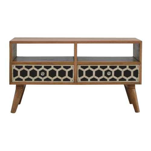 This media unit has a clean and simple design to suit most homes, it has been constructed from 100% solid mango wood in a lovely oak-ish finish and features 2 bone inlay drawer fronts with 2 glass knobs and Nordic style legs. The bone inlay is sourced responsibly from deceased animals such as camels, goats, and buffaloes.