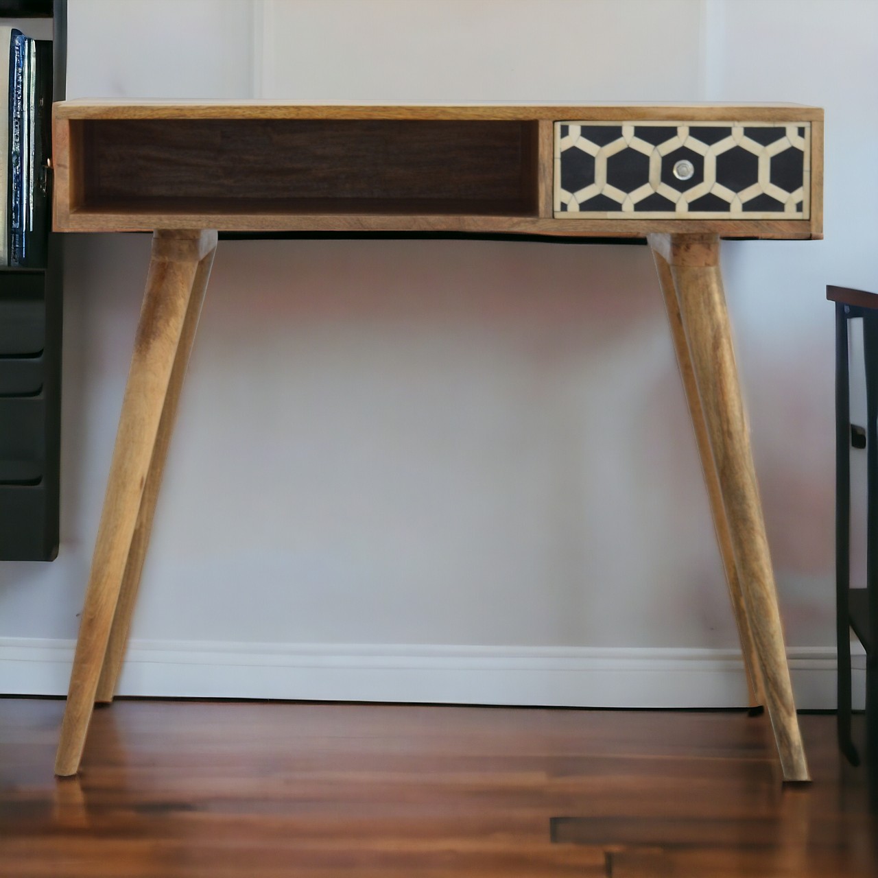 Inspired by vintage design, this solid wood writing desk provides ample space for you to work on. It is constructed from 100% solid mango wood and has a fine oak-ish finish. Other features include 1 open shelf, 1 bone inlay front drawer, and Nordic style legs. The bone inlay is sourced responsibly from deceased animals such as camels, goats, and buffaloes.