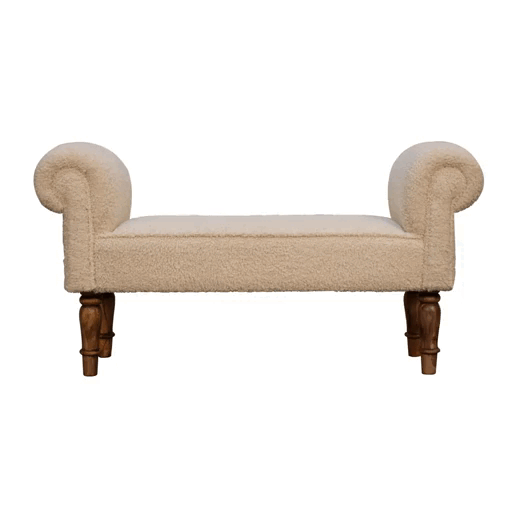 This lovely piece of furniture is ideal for a hallway, end of the bed, or simply any living area in your home which is also ideal for extra seating. It is upholstered in a luxurious boucle material featuring turned legs constructed from 100% solid mango wood in an oak-ish finish. This bench will add classic touch to any room and serve handy all over the home.