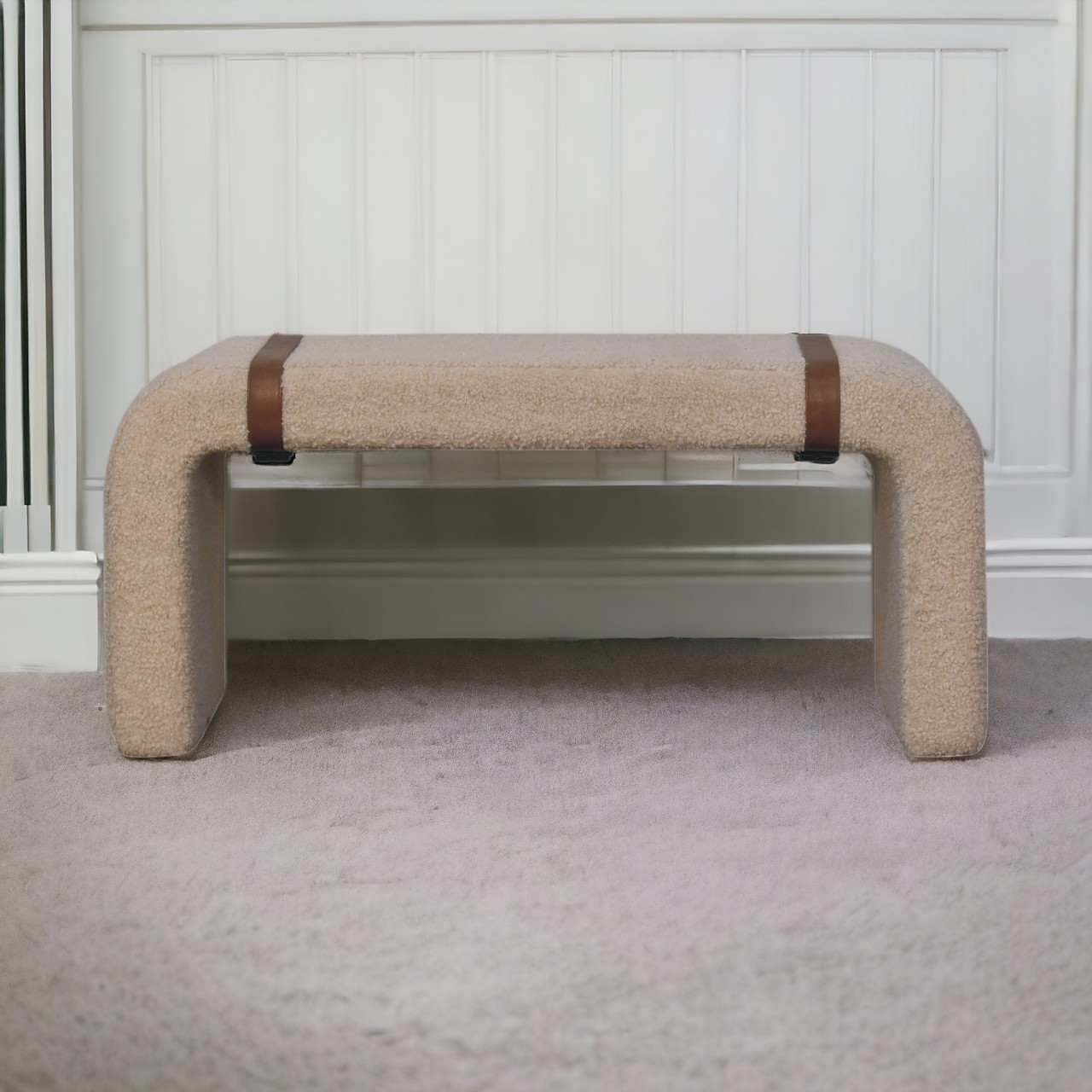 Derived from the French word for ‘curled’ or ‘ringed’ yarn or fabric. This handwoven upholstered furniture piece is made of 100% cotton and natural yarn. This bench showcases a contemporary curved design with a plush, cushioned top for comfortable seating. It features a distinctive belted strap design on both sides, making it an elegant addition to any hallway, reception area, or living room.