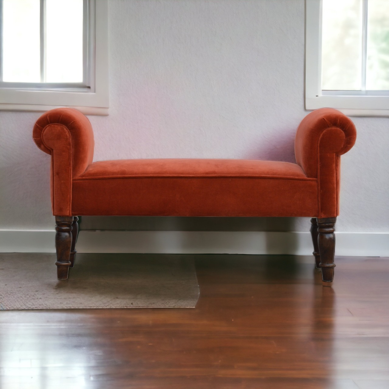 This lovely bench is ideal for a hallway, end of the bed, or simply any living area in your home which is also ideal for extra seating. In an amazing brick red cotton velvet featuring turned legs constructed from 100% solid mango wood in a walnut finish. This bench will add a pop of colour to any room and serve handy all over the home, available in many different colours.