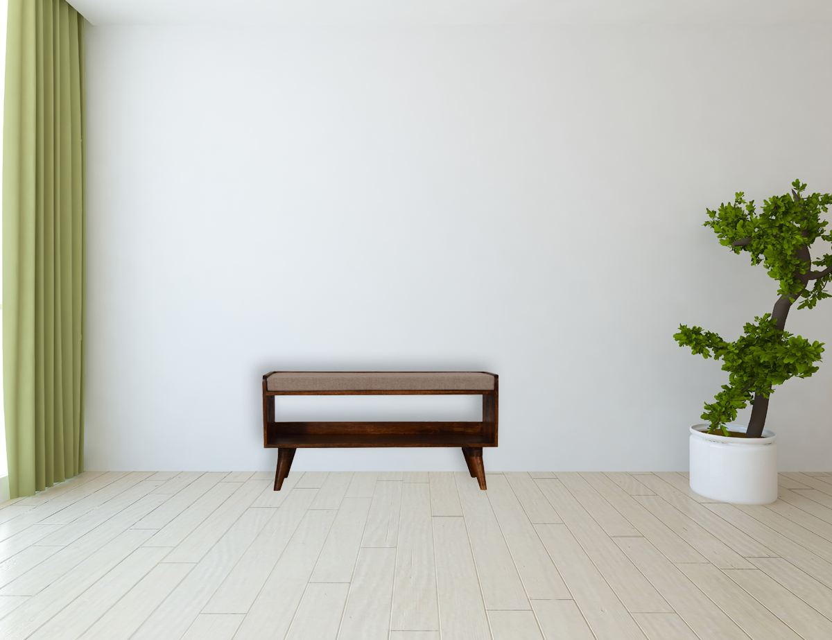 This bench has been beautifully made from 100% solid mango wood in a chestnut finish. This bench provides comfort ability with a comfy seat pad upholstered from brown tweed and can be used in a variety of settings such as the bedroom, hallway or living room.