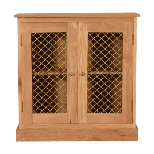 This rustic style cabinet has been constructed from 100% solid oak wood and finished in a smooth oak-ish finish. It features open caged doors and shiny brass knobs. Perfect for a hallway or living room.