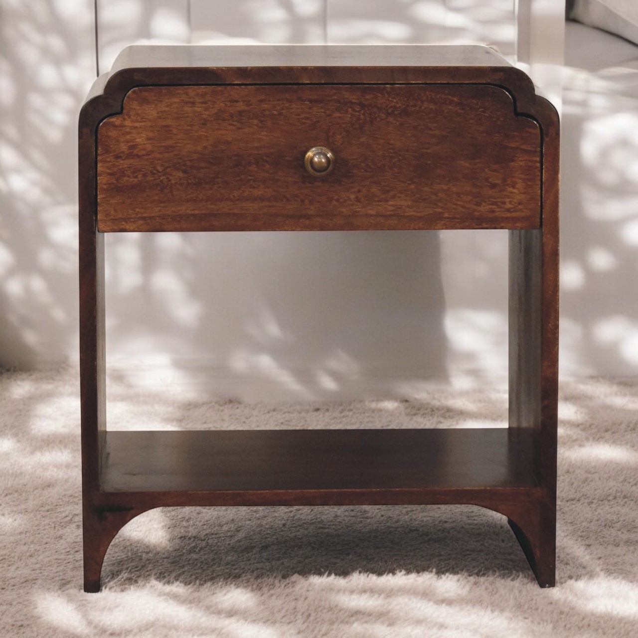 An elegant addition to your room, this California Walnut Newton Bedside is a stylish and practical piece of furniture. It includes a spacious drawer to store away miscellaneous items as well as a shelf underneath for extra space, it will surely be a welcome addition to your surroundings. It has been constructed from 100% solid mango wood in a california walnut finish along with a shiny brass knob.