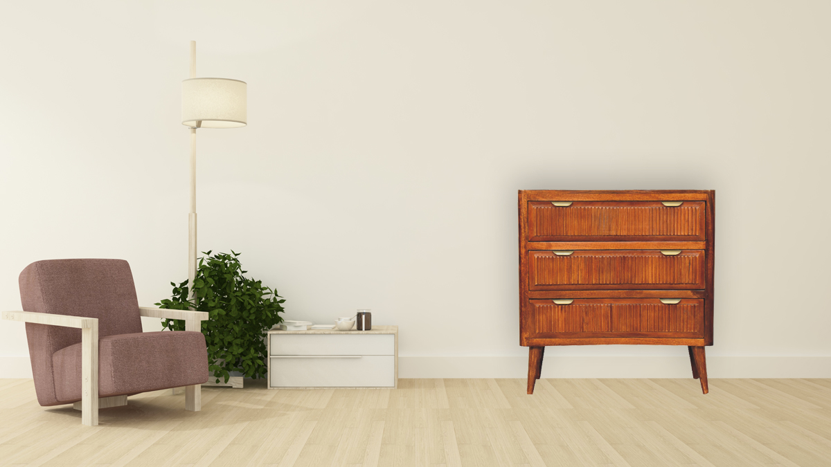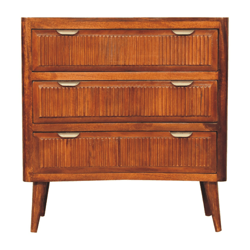 Create a focal point in the bedroom or guest room with our striking Capri Chest. It is constructed from 100% mango wood with a chestnut finish and has a ridged pattern on the drawer fronts. Other features include nordic style legs and brass handles. A matching nightstand is available for a co-ordinated look in your home.