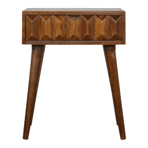 Enjoy the beauty of this nightstand in your bedroom, constructed from 100% solid wood in a chestnut finish. It features 4 Nordic style legs and one deep drawer to take care of everyday utility items. The main feature is the hand carved raised pyramid drawer front which is bound to add a nice touch and lasting character to your home.