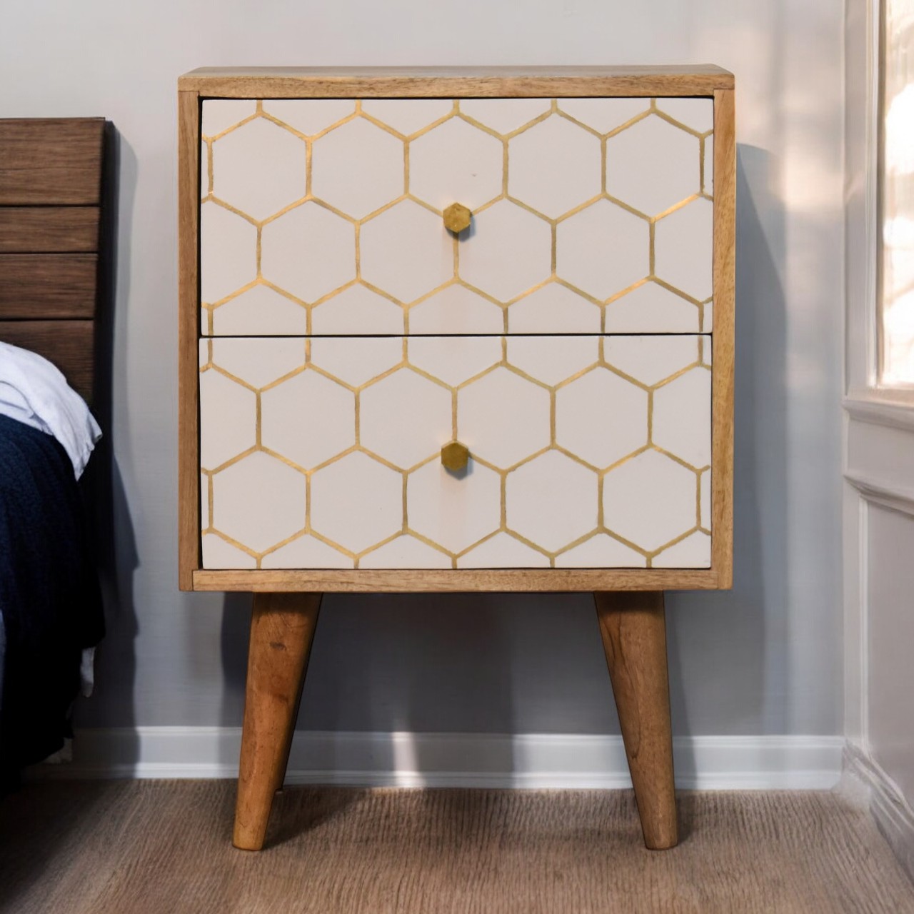 Providing an elegant and sleek design, this 100% solid mango wood nightstand has an oak-ish finish and has been given a clear lacquer for extra durability, it features hand-painted white drawer fronts which present a brass honeycomb inlay pattern to put away your bits and bobs. Other features include shiny brass knobs and nordic style legs.