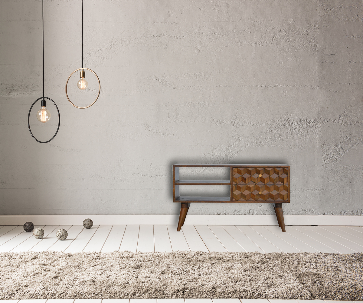 The main feature of this media unit is the hand carved cube drawer front which make the pieces from this collection stand out. It has been constructed from 100% solid mango wood in a chestnut finish, it features 2 open slot for extra storage and stands on 4 Nordic style legs. It can be partnered with the other pieces from the range or stand individually as its style is versatile and can fit into different types of interiors.