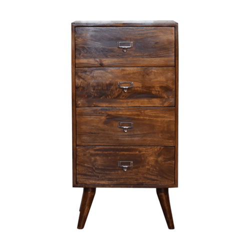 Constructed from solid mango wood in an oak-ish finish, this filing cabinet features Nordic style legs, and spacious drawers which have paper inserts in the handles, perfect for categorising and sorting files and important paperwork in a study room, home, or office.