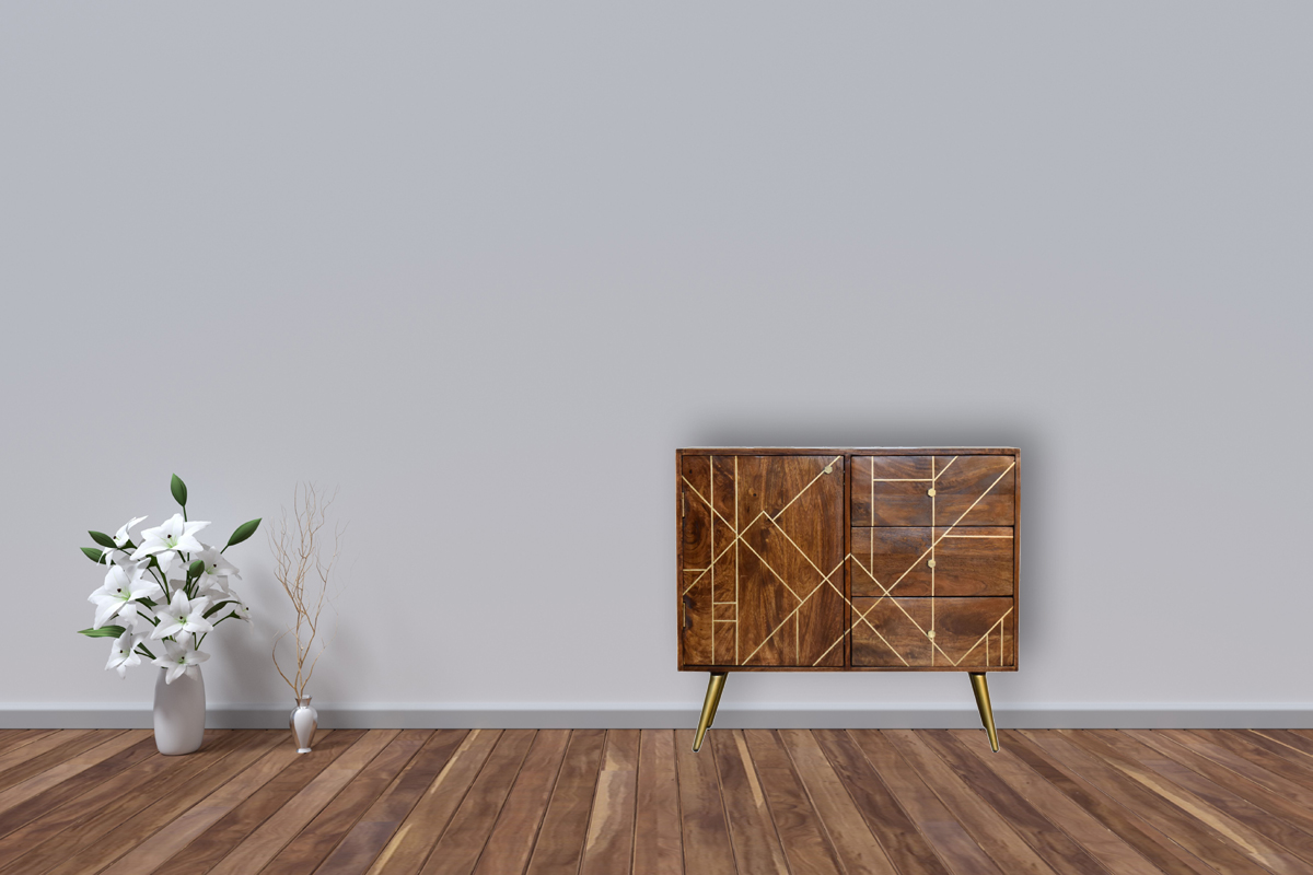 Constructed from 100% solid mango wood in a fine chestnut finish and offering plenty of storage space this sideboard will make the perfect addition to your bedroom. It features a gold abstract pattern on the door front and drawer fronts and stands on 4 brass Nordic style legs along with ample space on top for a lamp, candle, or photo frame.