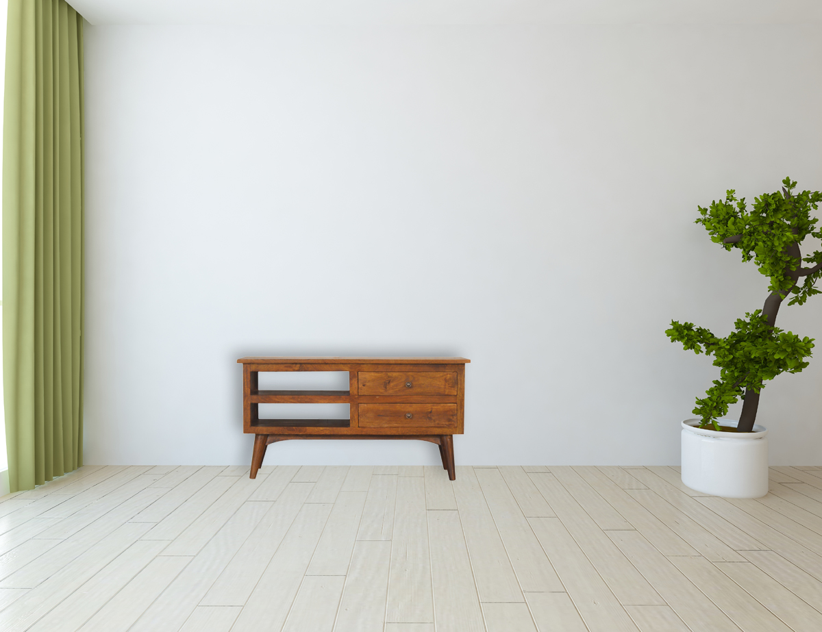 Our solid timber media unit is expertly constructed from 100% solid mango wood, and has a clean and simple design to suit most homes. This piece has a lovely chestnut finish and features carefully handcrafted joints, wooden runners and brass handles to the two drawers. It is carefully finished in a durable lacquer, to help protect and enhance the look of this solid piece of furniture.