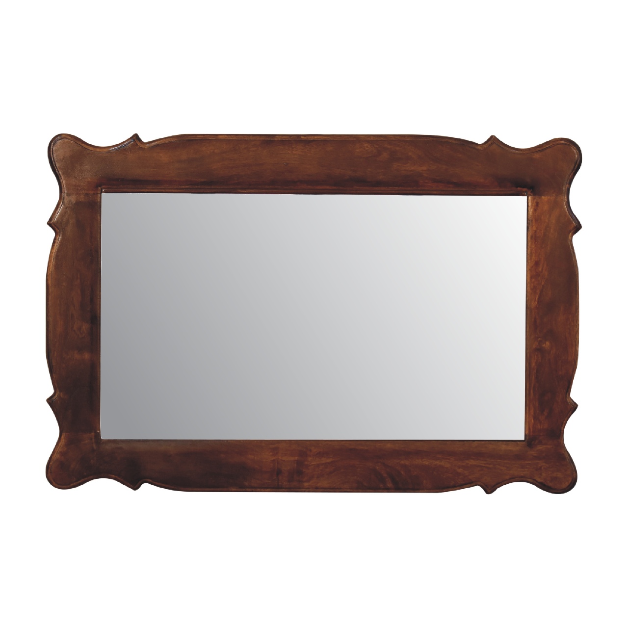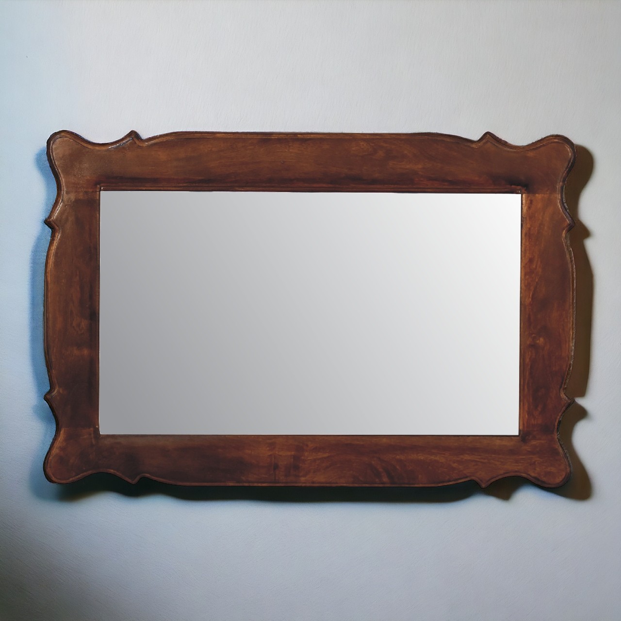 This high quality oblong shaped mirror is fitted into a beautiful, handcrafted 100% solid mango wood frame. It features a chestnut finish, with elegantly hand carved designs around the frame. All mirror frames are supplied with a metallic clips, for mounting it on the wall and are pre-fixed with a high quality mirror.