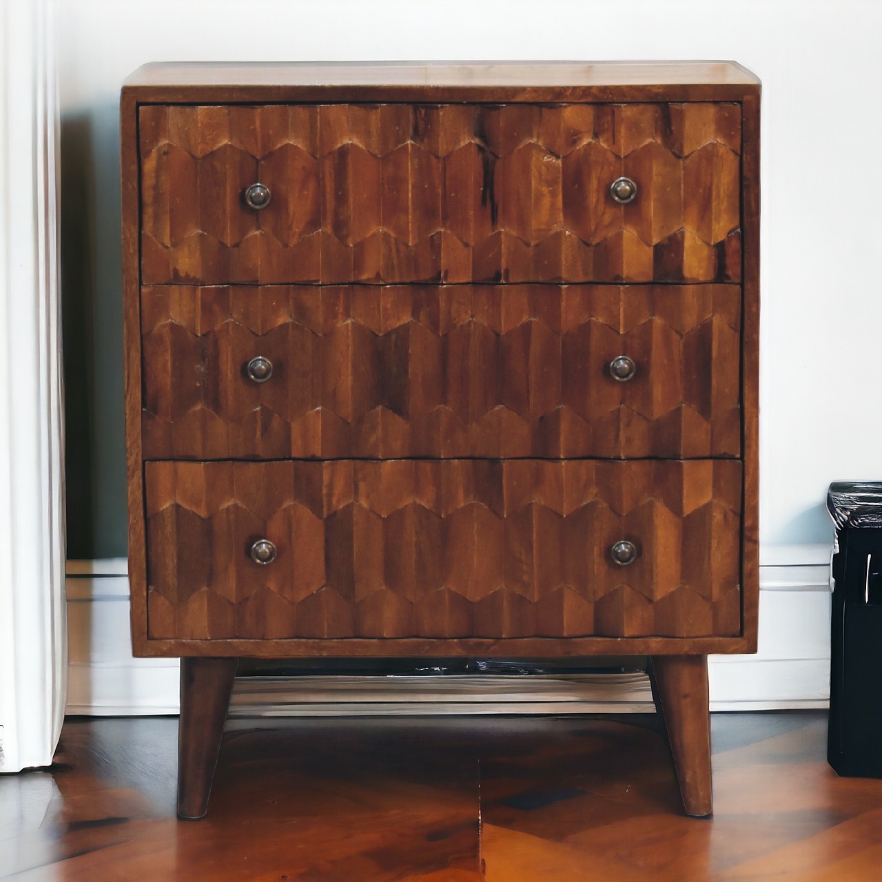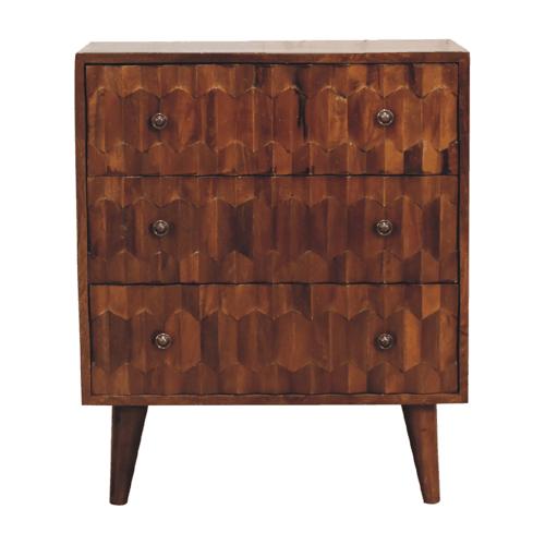 This multi-utility chest of drawers has been constructed from 100% solid mango wood and has a chestnut finish. Its unique design offers useful storage space with 3 large spacious drawers to take care of everyday utility items. It features shiny knobs, 4 Nordic style feet, and mainly the beautiful pineapple hand carved design on the drawers giving the product a unique look. It will add a definite and lasting character to any home space or living room.