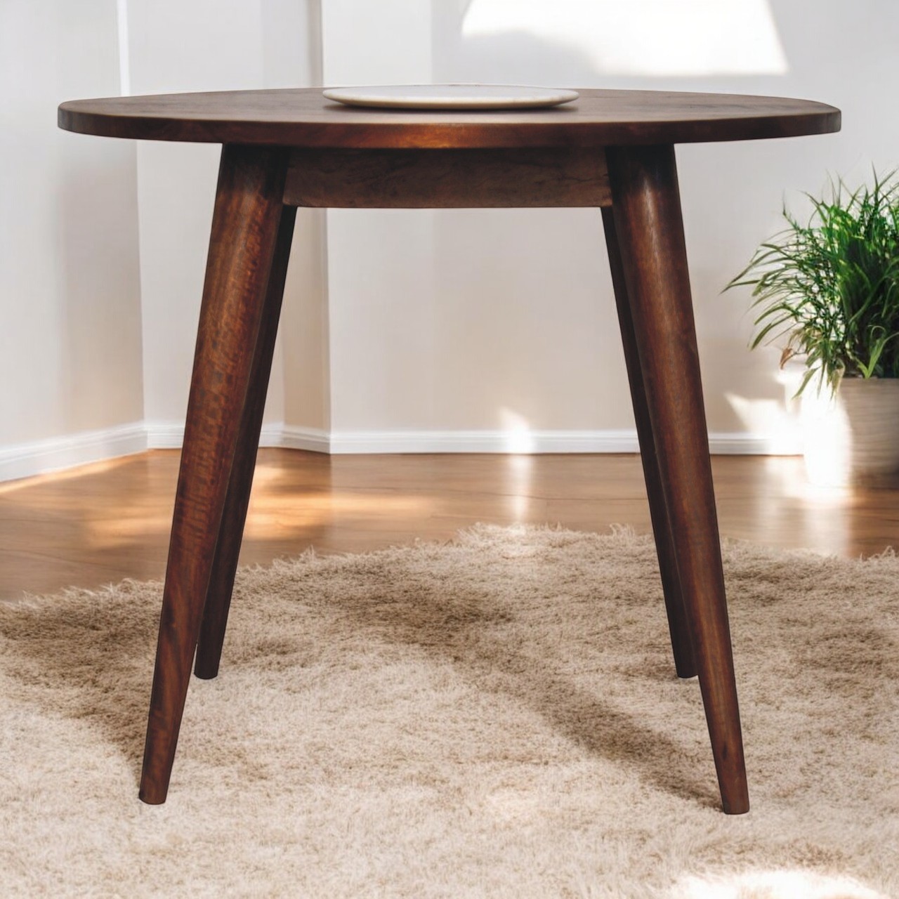 This dining table boasts a simplistic design perfect for getting together with family and friends for casual dinners in the home. It is constructed from 100% solid mango wood and has a fine chestnut finish along with nordic style legs for stability. (DOES NOT COME WITH THE PLATE)