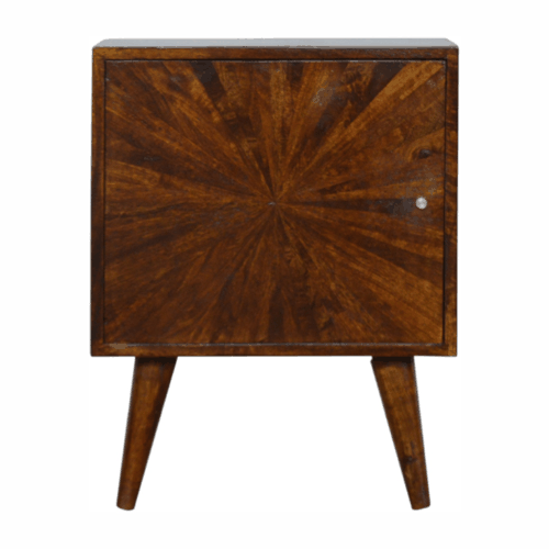 Showcasing the sunrise patterned door, this nightstand table has been constructed from 100% solid mango wood in a chestnut finish and small shiny knobs. Offering a modern retro aesthetic, this nightstand is a timeless option for your bedroom.