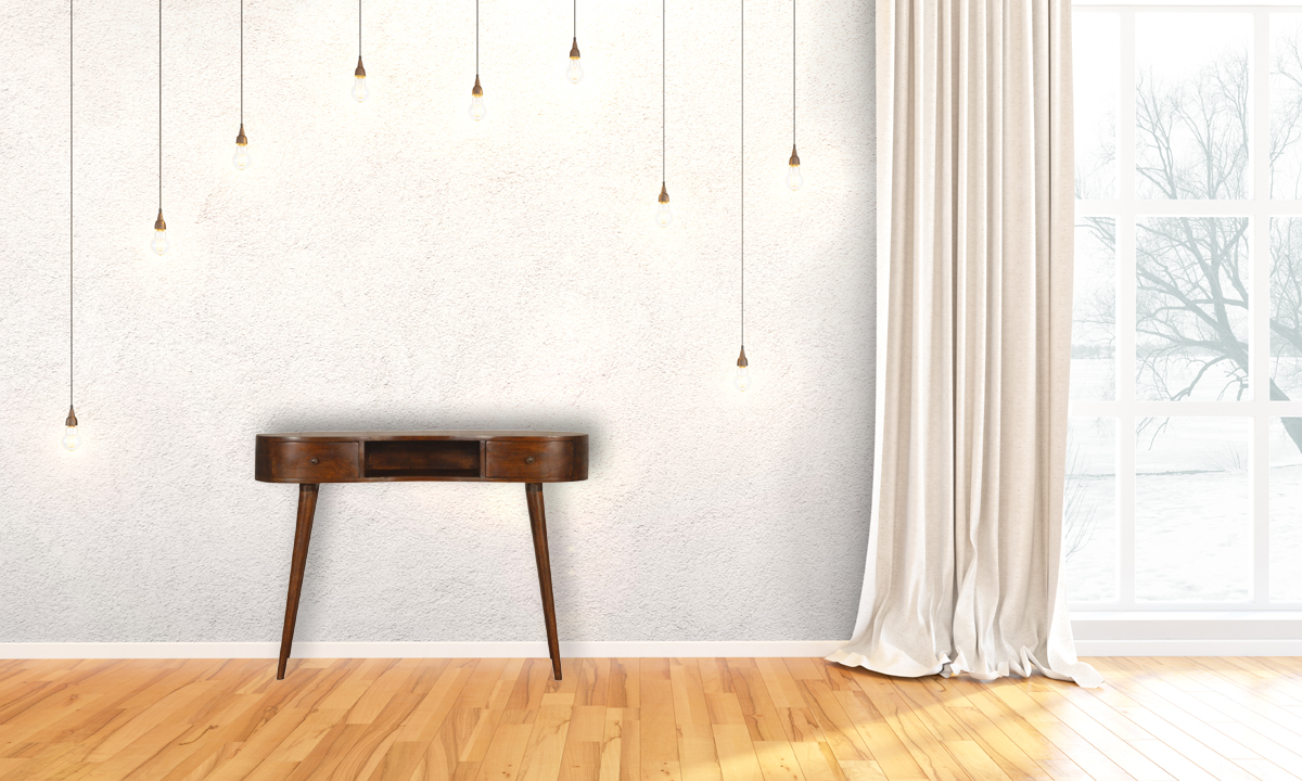This solid wood writing desk has been constructed from 100% solid mango wood in a chestnut finish and offers a unique shaped design with rounded edges. It features one open slot and 2 mini drawers which have shiny knobs and Nordic style legs. A great simple and add to the home._x000D_