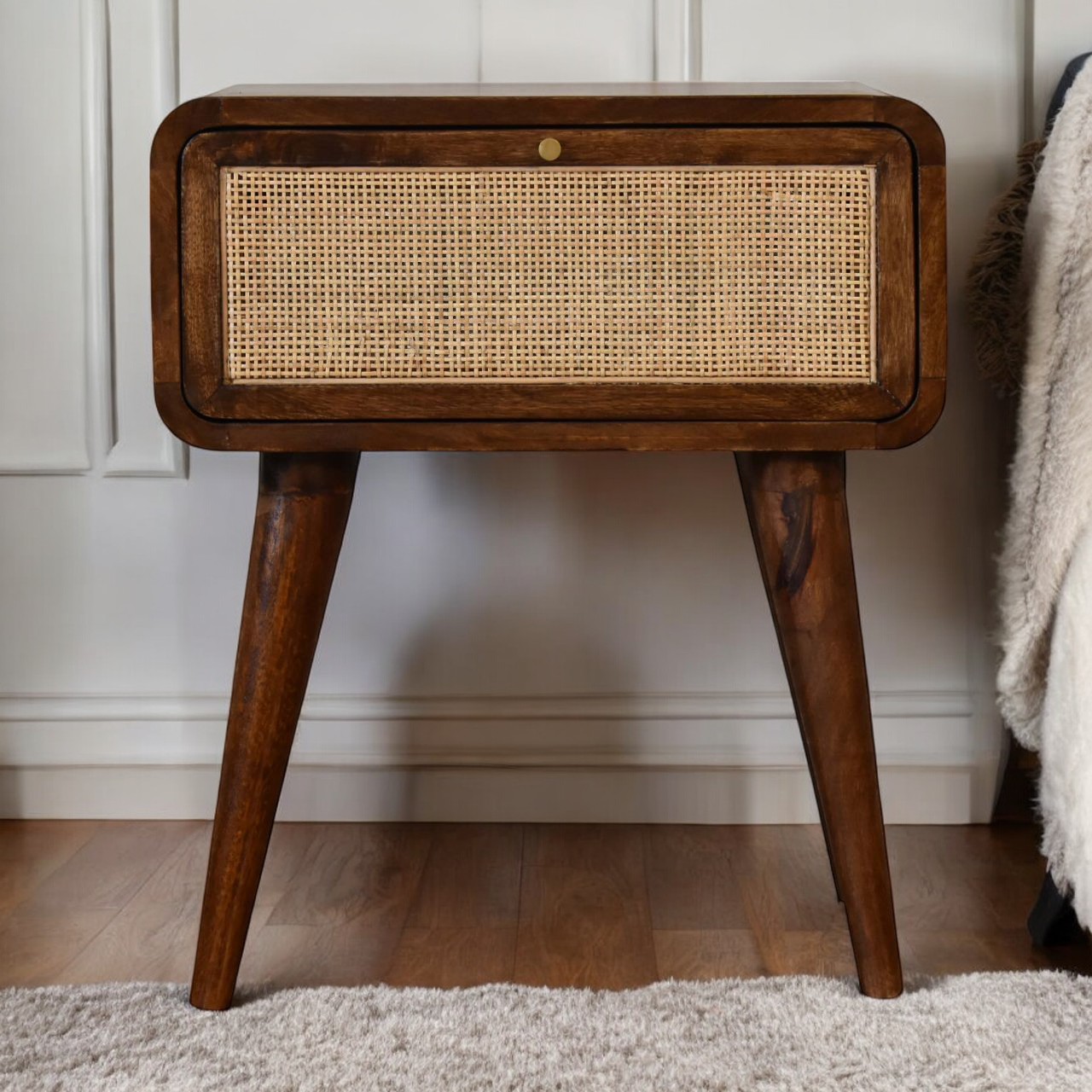 This stylish Nordic Woven nightstand combines a woven drawer front with a smooth chestnut finish body and legs. Constructed from 100% solid mango legs it has a shiny knob on the drawer and nordic style legs. Make full use of this nightstand in the bedroom and partner it with the rest of the collection.
