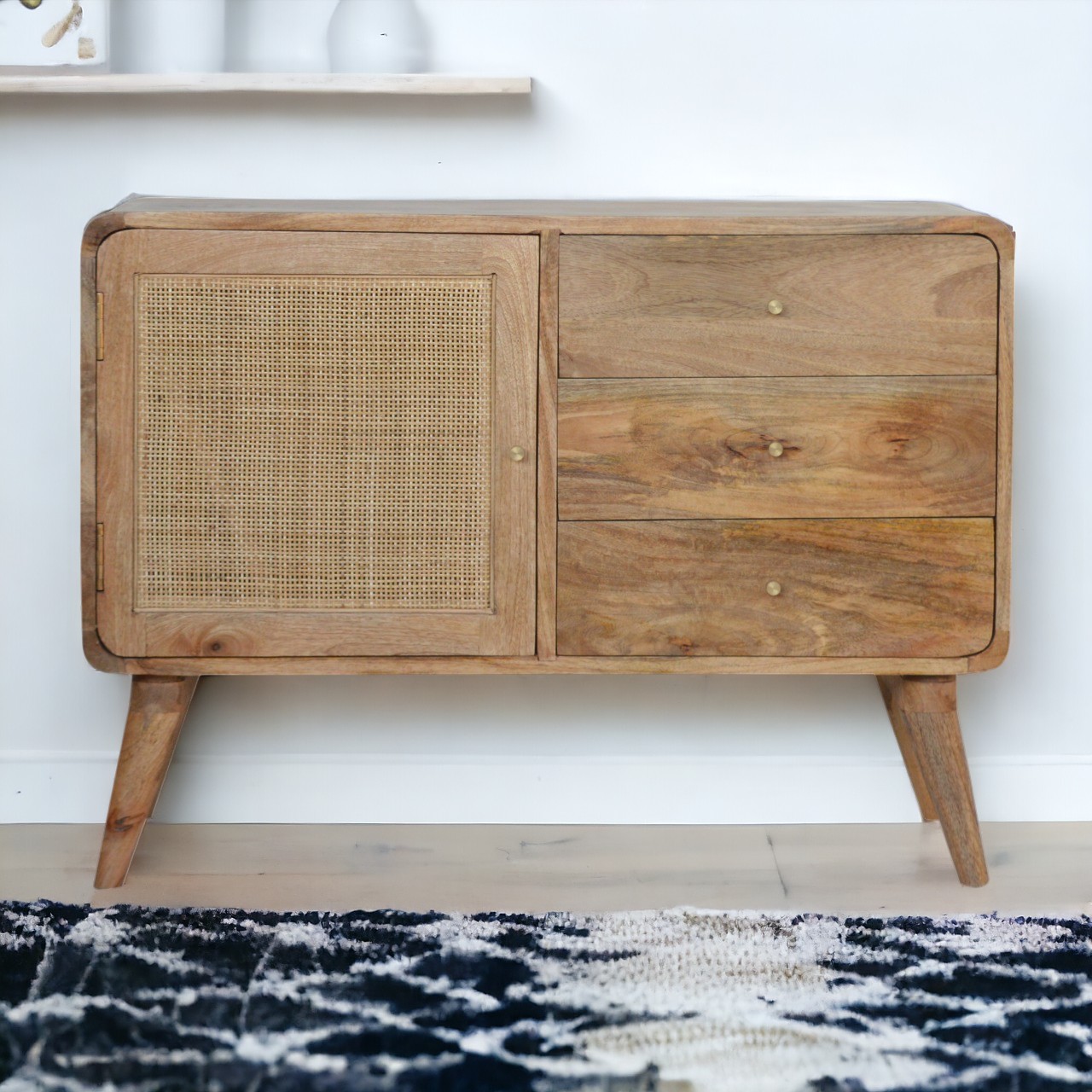This stylish Nordic Rattan sideboard combines a woven door front with a smooth oak-ish finish body and legs. Constructed from 100% solid mango legs it features 3 spacious drawers perfect for storage, a shiny knob on the drawers, and nordic style legs. Make full use of this cabinet in the living room and partner it with the rest of the collection._x000D_