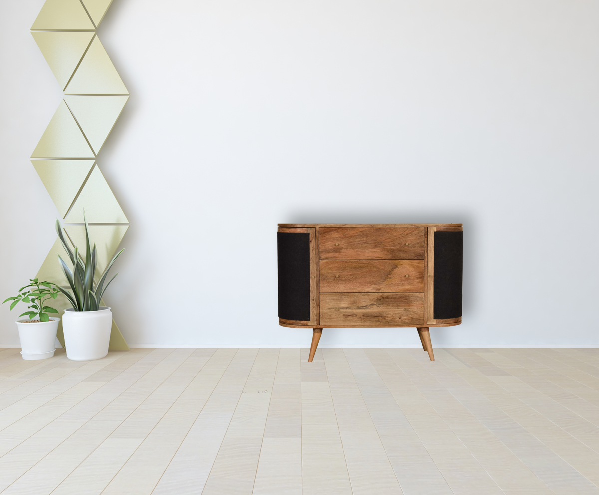 This stylish cabinet combines 2 black battleship tweed door fronts with a smooth oak-ish finish body and legs. Constructed from 100% solid mango legs it features 3 spacious drawers perfect for storage, shiny knobs on the drawers, and nordic style legs. Make full use of this cabinet in the living room or partner it with the rest of the collection.