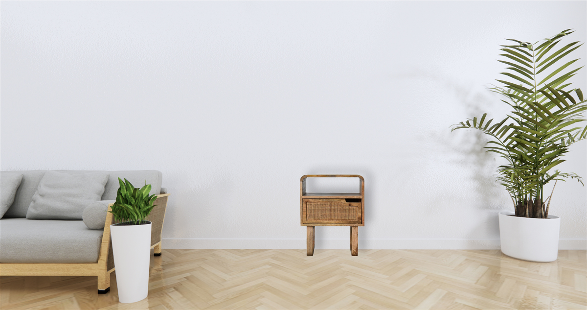 Stylish and sophisticated, this Tallin nightstand boasts an elegant styling, perfect for adding a contemporary touch to your home. The gorgeous range is finished in an oak-ish finish with a rattan drawer front help to brighten your room some other features include an open slot, a decent size cut-out for easy access intoto the drawers and U-shape legs