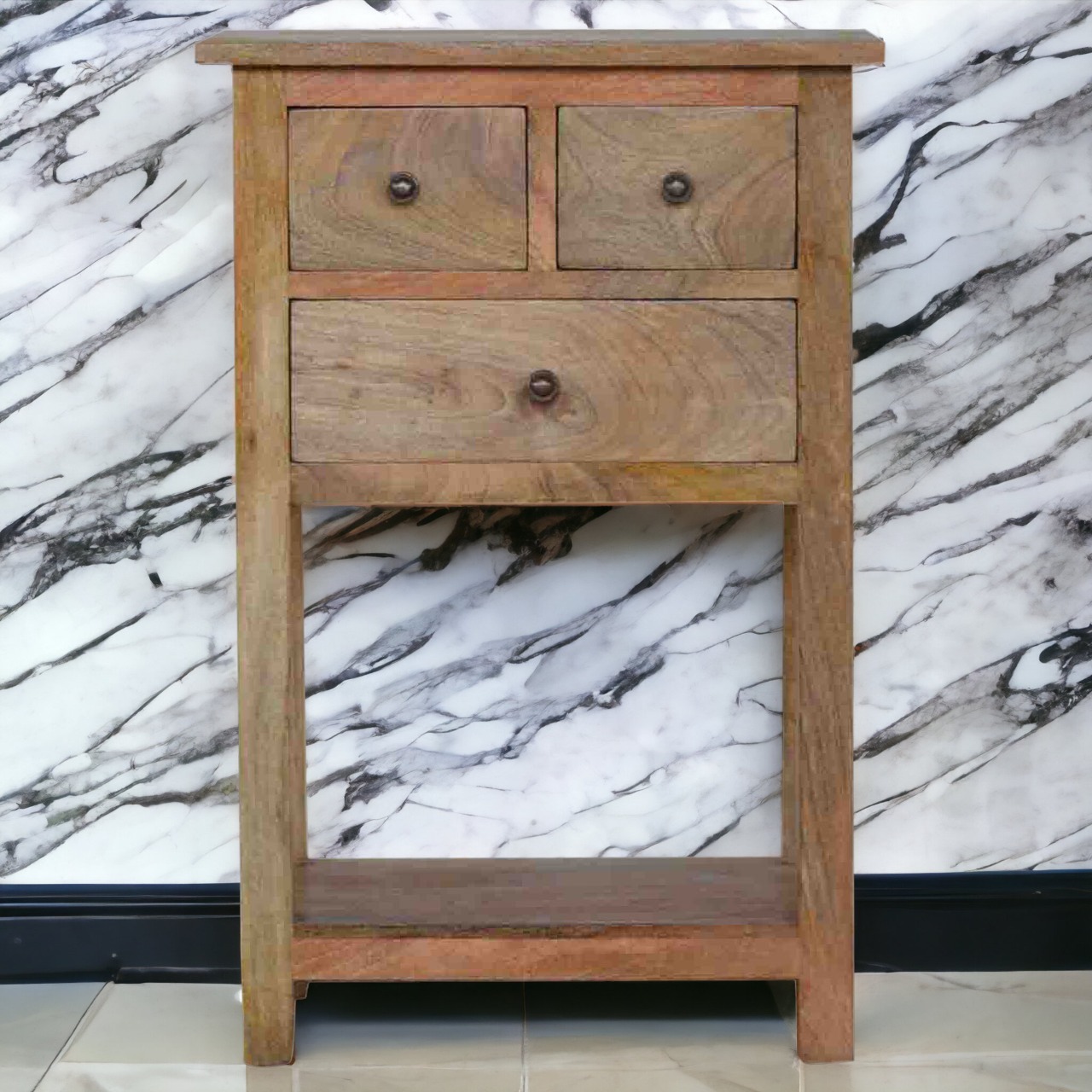 Beautifully handcrafted this country-style telephone table is a practical piece that provides useful storage for the hallway or any other living area. It is made from solid mango wood and has a fine oak-ish finish. Some features include three small drawers with shiny knobs and a handy shelf at the bottom. Every piece of furniture is individually handcrafted and includes swing care tickets explaining the cautions and aftercare instructions.