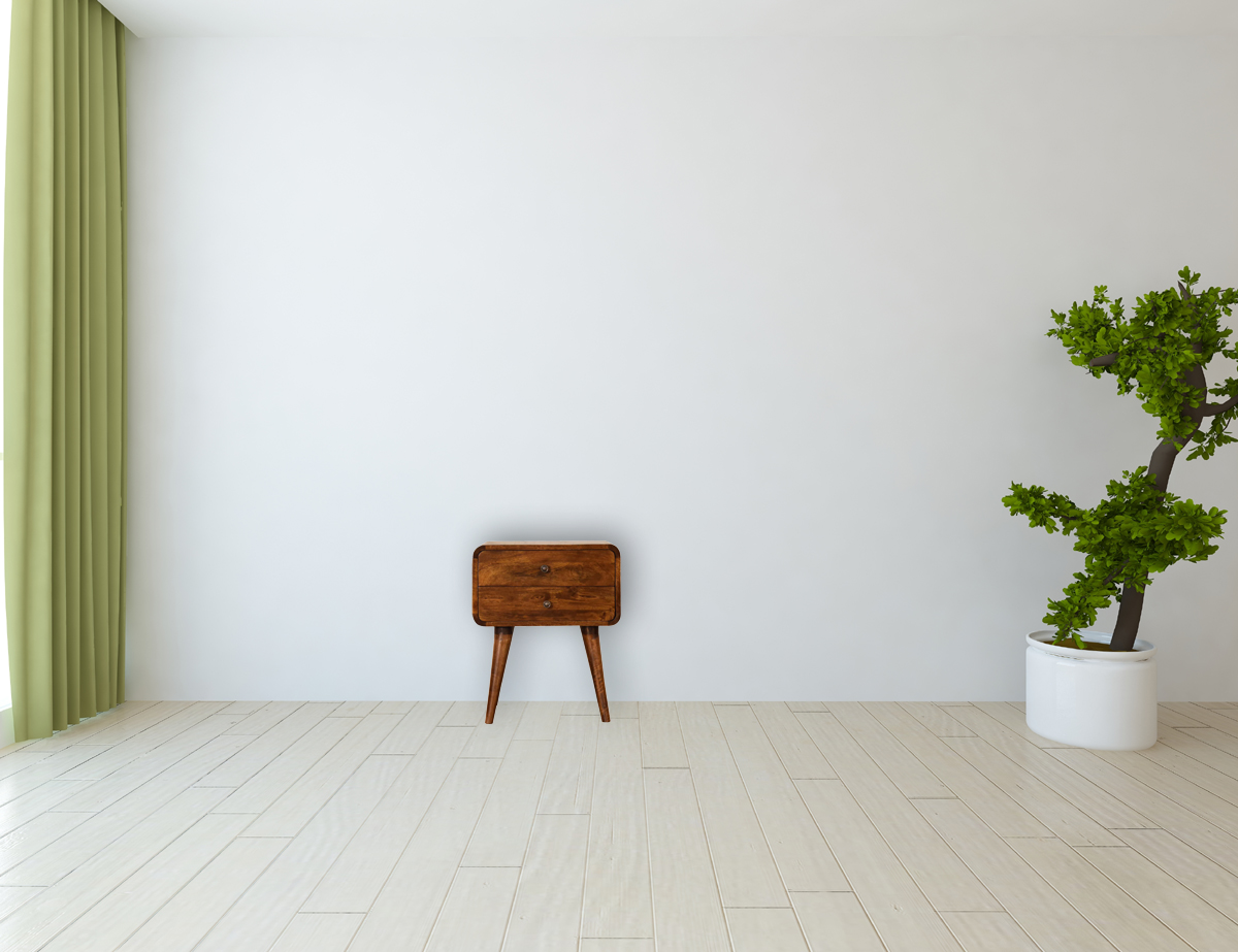 Endlessly versatile, this nightstand table makes a perfect stand for nibbles, drinks, or a lamp. It is made from 100% solid mango wood in a fine chestnut finish and has nordic style legs. It has curved edges which will fit into any home/living space. Cable access is provided which allows you to plug in any electronic device with no fuss.