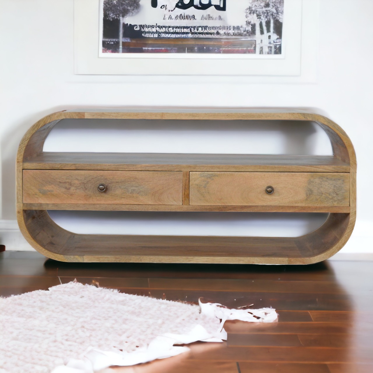 This solid wood TV Unit has been constructed from 100% solid mango wood in an oak-ish finish and offers a nice curved look on the edges. It features 2 drawers which come with a shiny knob and 2 open slots for extra storage. A great, simple addition to the living room.