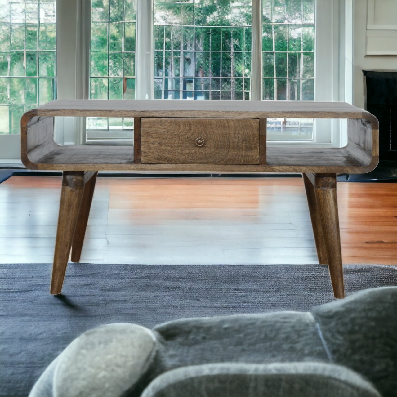 This Coffee Table has a modern design that offers clean, curved edges. It has been constructed from 100% Solid Mango Wood in a grey washed finish. Some features include 2 drawers that have shiny knobs, 2 open slots to place any books, photo frames, ornaments, etc, and 4 Nordic style legs.