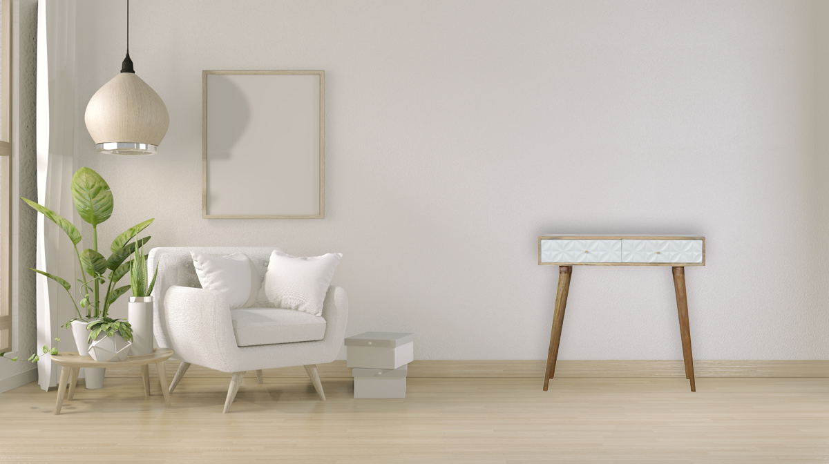 This beautiful console table has been constructed from 100% solid mango wood in an oak-ish finish with unique diamond hand carved drawer fronts that have been hand painted white. It features 4 Nordic style legs and two deep drawers to take care of everyday utility items. This console table will prove handy in your living room or hallway.
