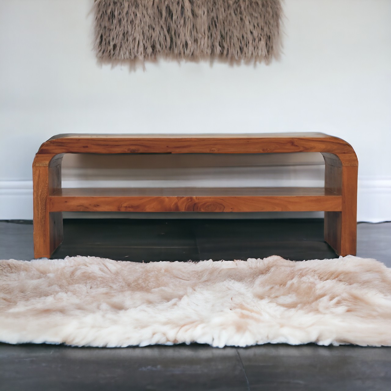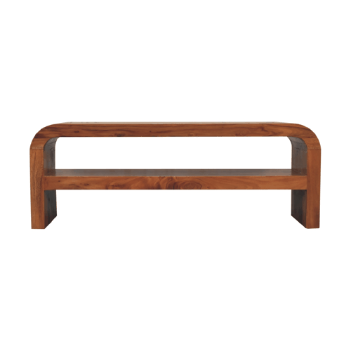 Add this Darcy Media Unit to your interior, it has smooth round edges, making it child and pet friendly in the home. It is constructed from 100% solid acacia wood in an caramel finish and features a large open drawer that can be used to store game consoles, tv boxes and more.